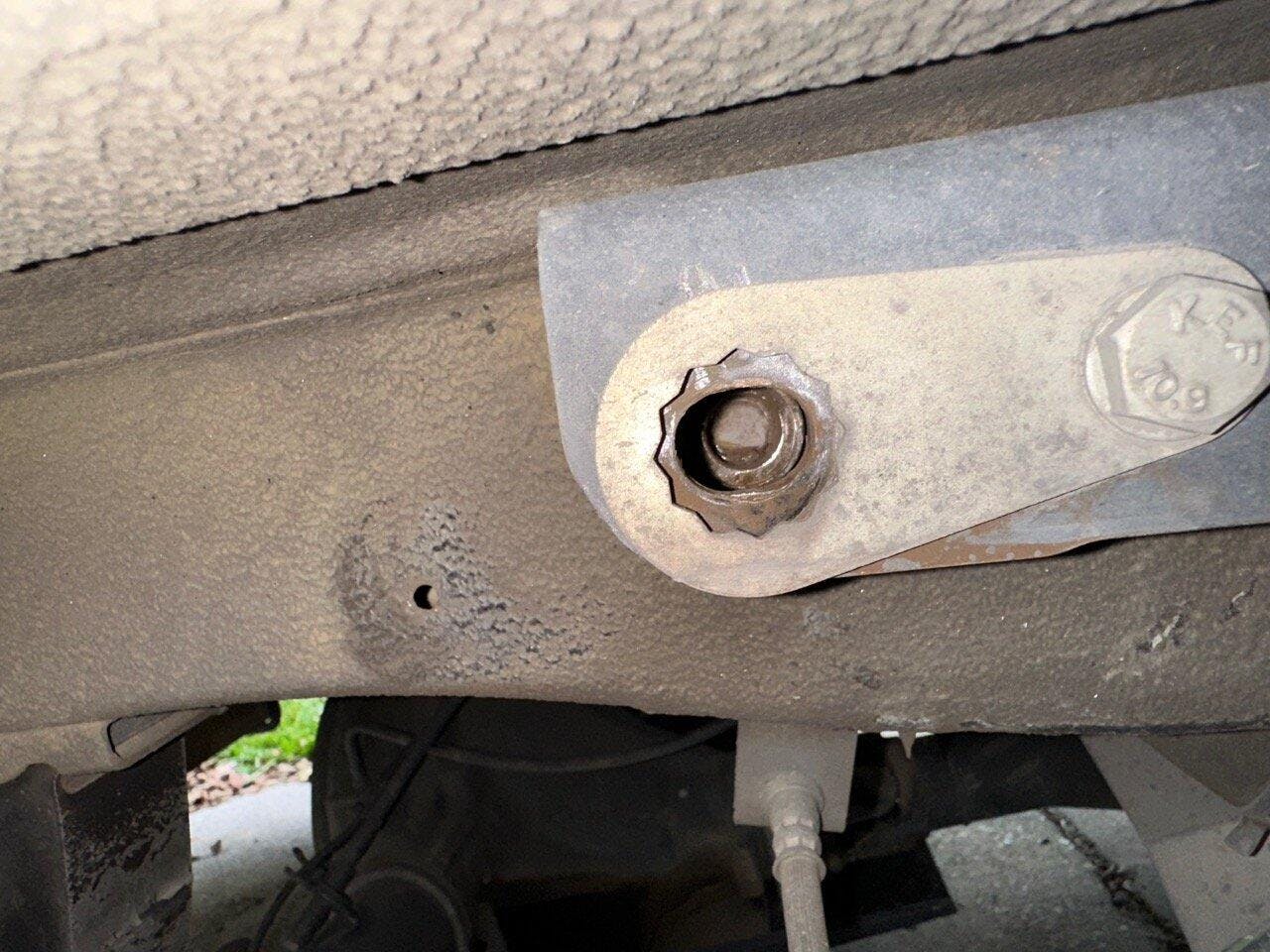 When I went to check torque on suspension bolts I immediately saw the problem. The upper shock bolt had sheared, leaving the top of the Van Compass Falcon adjustable shock restrained by the brake hose and hitting the leaf spring and the threaded portion of the broken Van Compass replacement bolt (installed with red loctite per instructions) remaining in the frame. The Baja Brackets had been installed approximately 20,000 miles ago, nearly all highway mileage.
