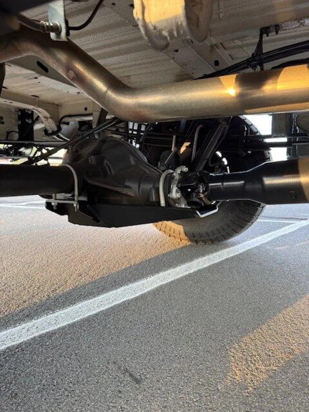 Thanks to a low hanging factory cover loss of gear is a real concern for Sprinter owners, whether from a low hanging obstacle or careless shop tech using the wrong jack point. Our differential skid plate protects the driveshaft u-joint, cast iron differential center section and lower portion of the thin sheet metal differential cover from being peeled back, and bolts on in minutes with simple hand tools. Gear oil changes can still easily be performed without skid plate removal.